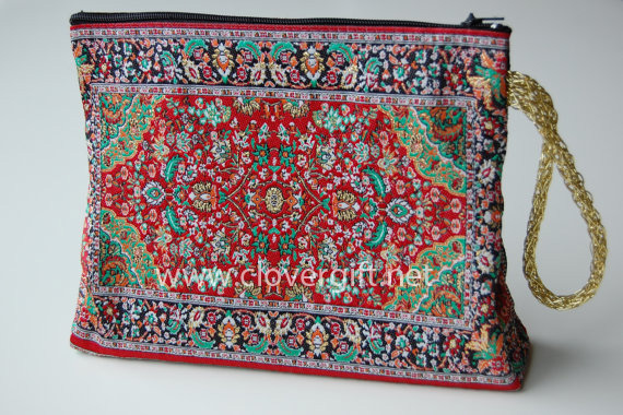 Authentic make-up purse bag has a woven miniuatue rug with unipue Persian Rug designs on each side,